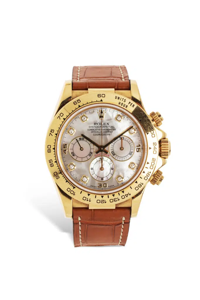 Créée en 1963 pour les pilotes automobiles, la Daytona est aujourd’hui l’un des modèles les plus cotés. Le modèle “Paul Newman”, reconnaissable à son cadran spécifique, a atteint des records en vente publique. Par exemple, la Daytona réf. 6239 ayant appartenu à Paul Newman a été adjugée 17,8 millions de dollars chez Phillips en 2017 (lot 8).