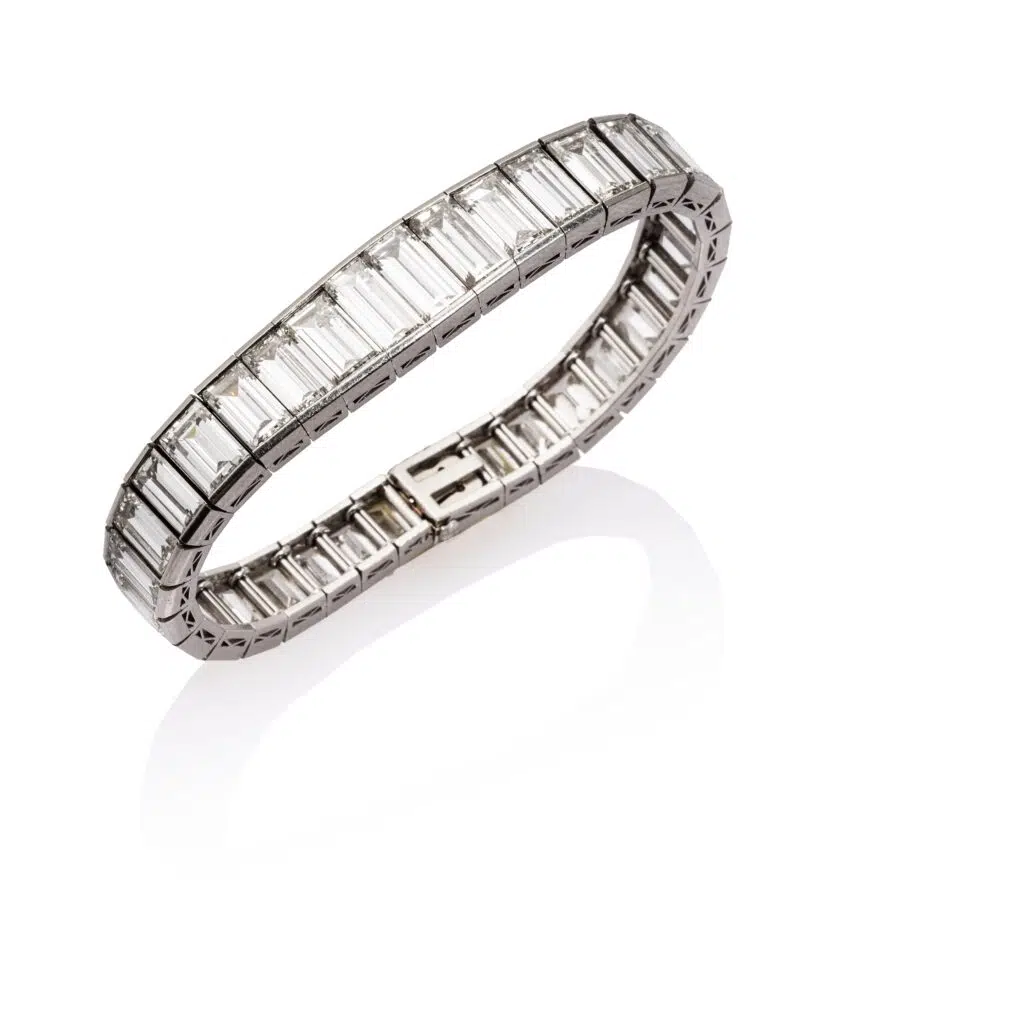 Orné de 34 diamants rectangulaires baguette, disposés en chute sur un serti rail, il offre une ligne continue et structurée qui en fait un modèle classique et recherché par les collectionneurs.