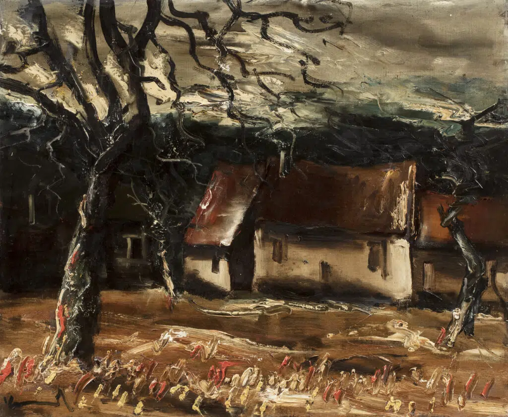 Connu pour son approche puissante de la couleur et sa manière expressive de traiter le paysage, Vlaminck livre ici une scène où la nature et l’architecture se mêlent sous un ciel chargé, renforçant l’intensité dramatique de l’ensemble.