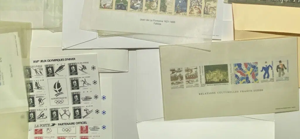 Ce lot contient des exemples emblématiques comme le feuillet des Jeux Olympiques d’Albertville 1992, la série Jean de La Fontaine, ou encore des émissions culturelles telles que “Relations culturelles France-Suède” ou “La Cinémathèque française 1936–1986”.