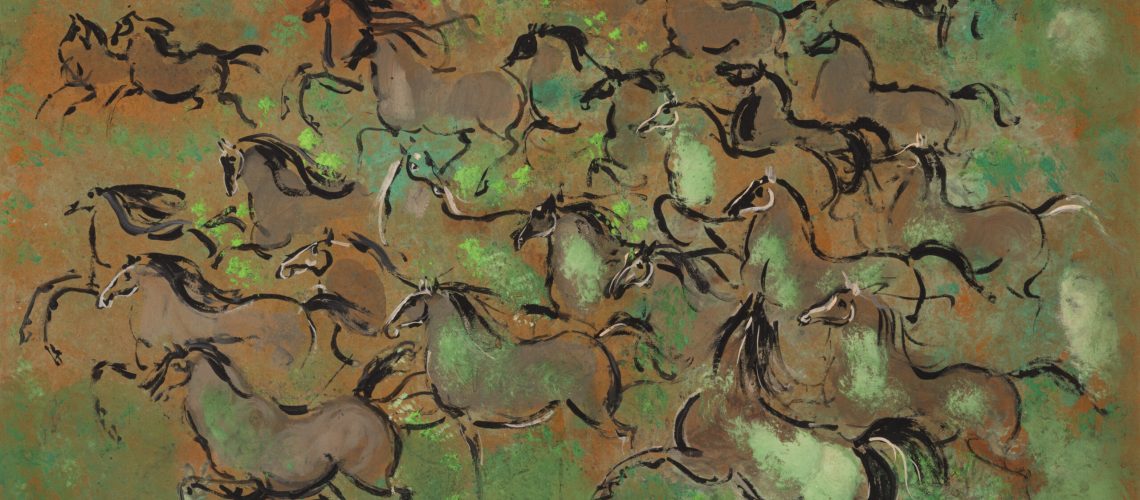 Dans “Chevaux en liberté”, l’artiste parvient à transmettre à la fois la fougue et l’harmonie du mouvement grâce à une palette contrastée où les tonalités de brun et de noir se détachent sur un fond vert nuancé.